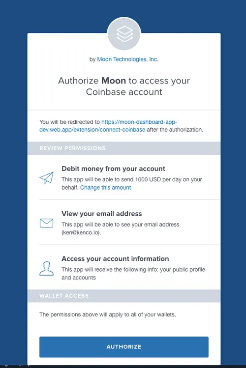 5. When connecting your Coinbase account with Moon, Coinbase will ask you to authorize Moon to access your Coinbase account.