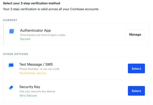 Note: You will not be able to make purchases from your Coinbase account if you select "Security Key" as your 2-step verification method.