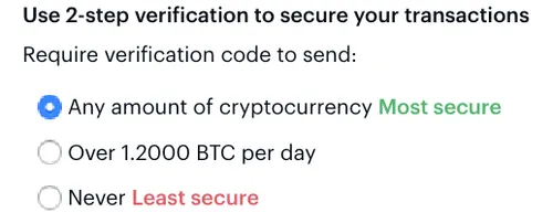 5. At the bottom of the page, choose whether to enable 2-step verification on transactions. We recommend you enable 2-step verification for any amount of cryptocurrency for added security.
